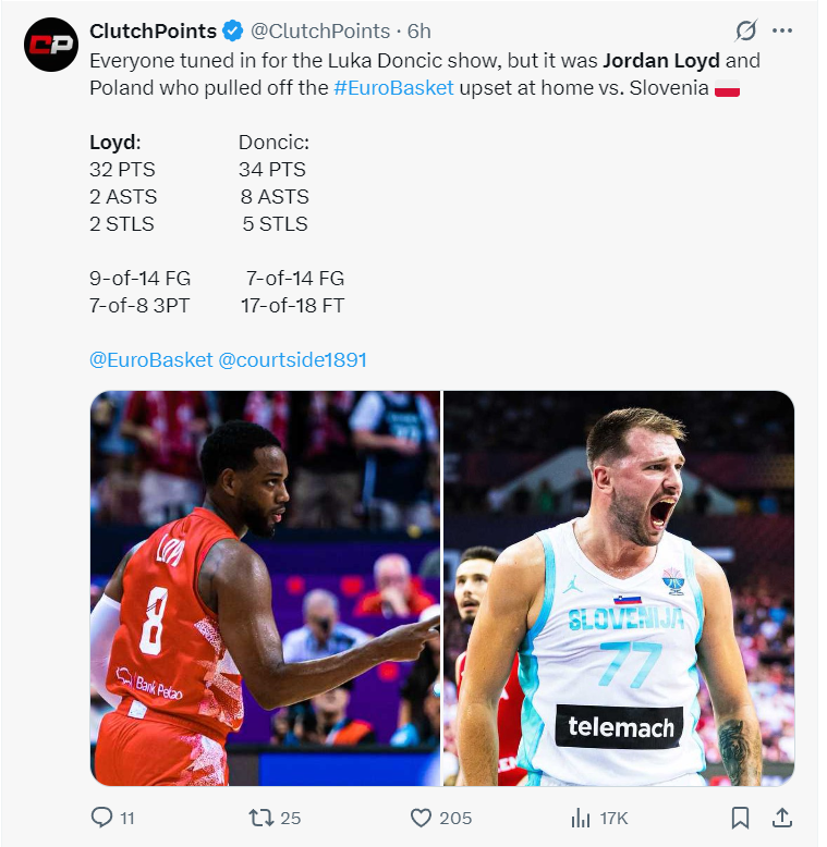 北京时间8月29日凌晨,2025年男篮欧洲杯小组赛,波兰男篮105-95击败斯洛文尼亚男篮拿到开门红。D组的以色列、波兰、法国都拿到首胜,斯洛文尼亚、冰岛、比利时都遭遇开门黑。斯洛文尼亚在有卢卡-东契奇这位NBA天皇巨星的情况下还是不敌波兰让不少欧媒议论纷纷。三年之前波兰男篮也击败了斯洛文尼亚,那场比赛波兰90-87险胜3分,当时赢球的第一功臣是波尼特卡拿到...